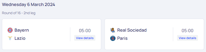 그다음 날 경기는 이탈리아의 라치오와 독일의 바이에른 뮌헨, 그리고 프랑스의 파리 생제르맹과 스페인의 레알 소시에다드의 경기입니다. 뮌헨에는 김민재 선수가 뛰고 있고, 파리 생제르맹에는 이강인 선수가 뛰고 있어서 한국 축구팬분들이 가장 기대하는 16강 경기가 될 것 같습니다. 서로의 상대도 만만하지 않네요. 굉장히 재밌는 경기가 될 것 같습니다. 레알 소시에다드에는 일본의 쿠보 선수가 뛰고 있는데 이강인 선수와 친구죠. 친구 간의 대결도 기대됩니다.