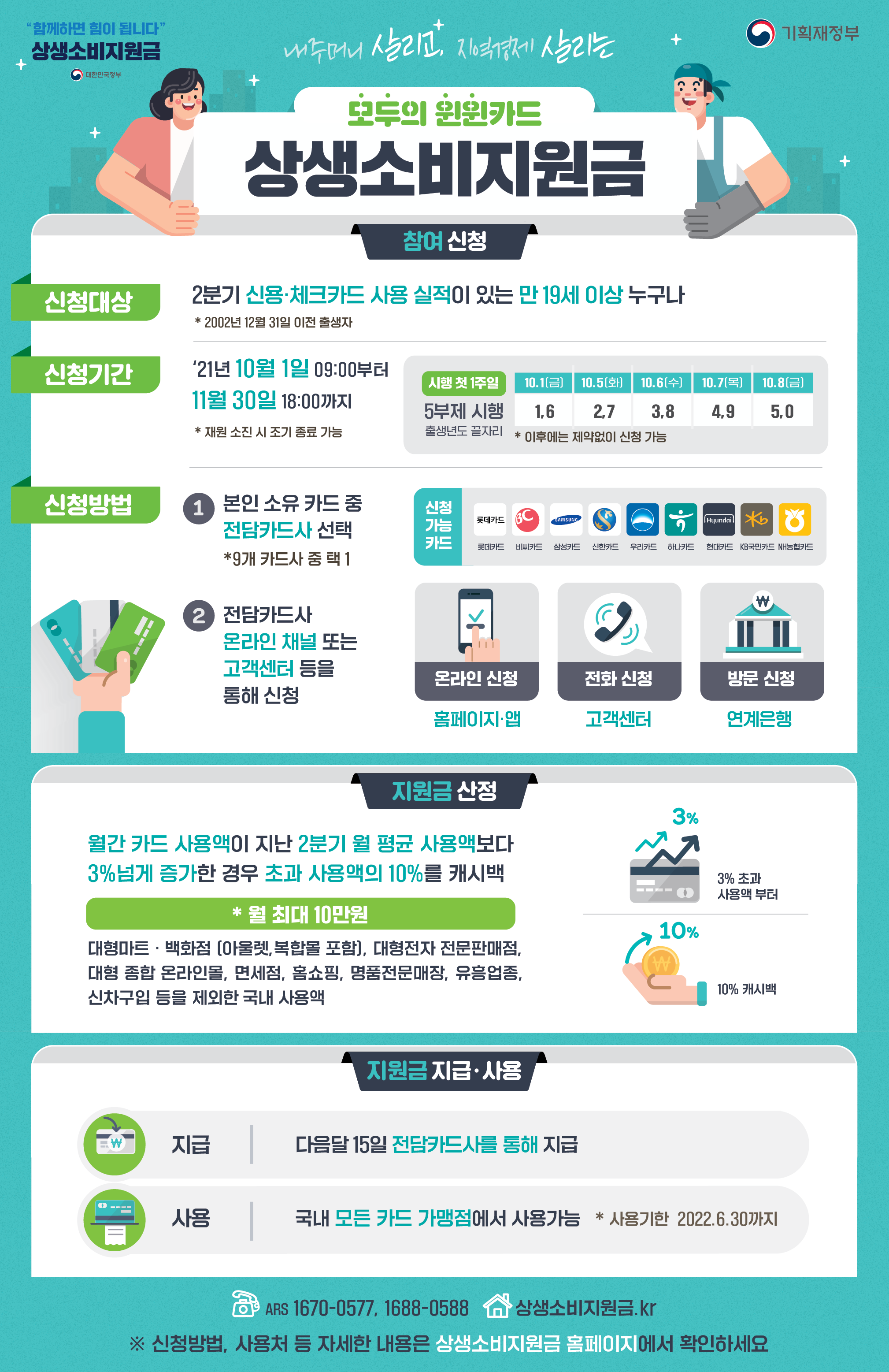 신용/체크카드를 지난 2 분기 월 평균 사용액보다 3% 많이 쓰면, 그 3% 초과분의 10%를 1인당 월 10만원까지 현금성 충전금으로 환급해주는 지원 사업