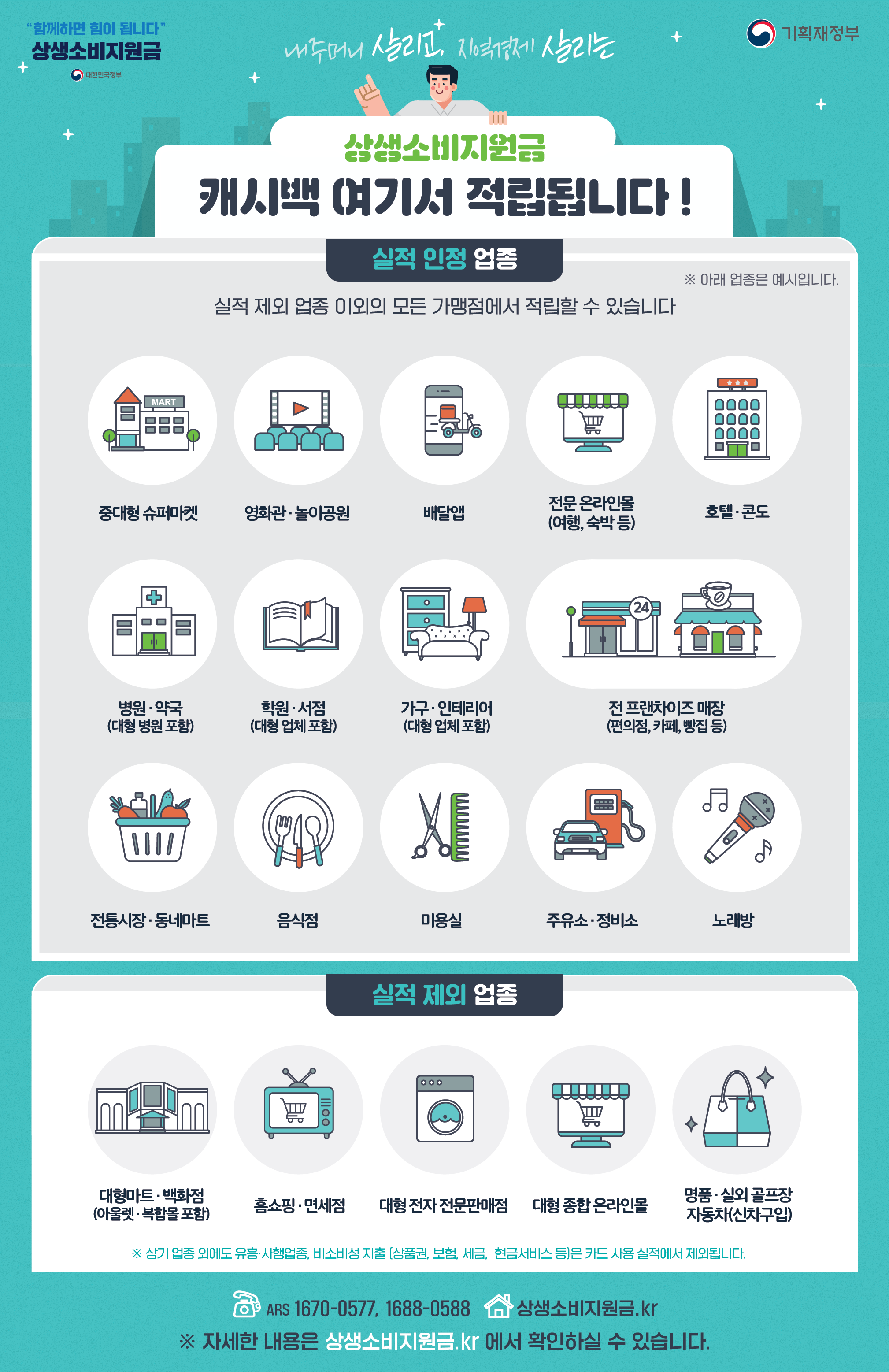 대형마트, 대형 종합 온라인 몰, 대형 백화점, 홈쇼핑, 복합 쇼핑몰, 유흥업종, 면세점, 사행업종, 대형 전자 전문 판매점, 신규 자동차 구입, 명품매장, 실외 골프장, 기타 소비(연회비, 세금, 보험, 상품권, 선불카드 충전액, 현금서비스, 카드론, 카드 수수료 등)