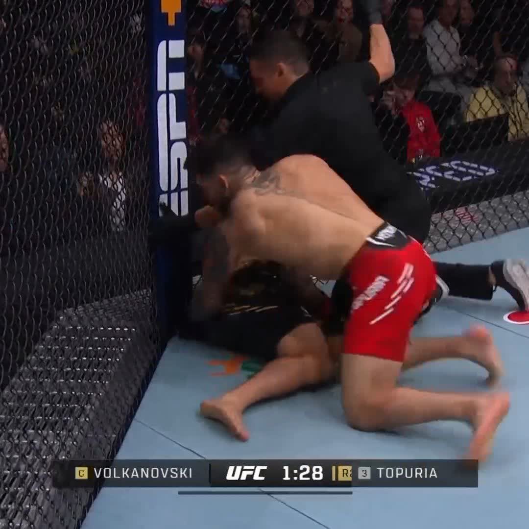 이 한방에 결국 볼카노프스키가 털썩 주저앉았다. 토푸리아는 기회를 포착하고 바로 파운딩을 퍼부었다. 주심이 경기를 마치면서 토푸리아가 승리를 거머쥐었다.
