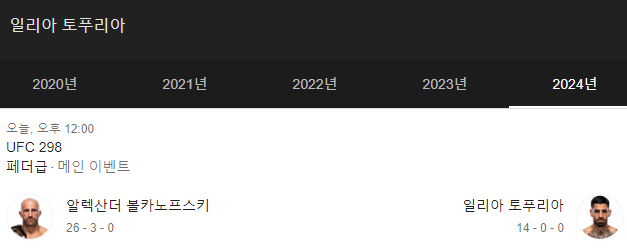 알렉산더 볼카노프스키(Alexander Volkanovski·36)와 일리아 토푸리아(Ilia Topuria·27)의 UFC 페더급 타이틀전이 18일(한국시간) 미국 캘리포니아주 애너하임 혼다 센터에서 UFC 298 메인 이벤트로 열렸습니다. 1988년생 알렉산더 볼카노프스키와 1997년생 일리아 토푸리아의 맞대결이었는데 둘 사이 나이 차가 아홉 살로 사실상 '신구 대결'이라는 평이 지배적이었습니다.
