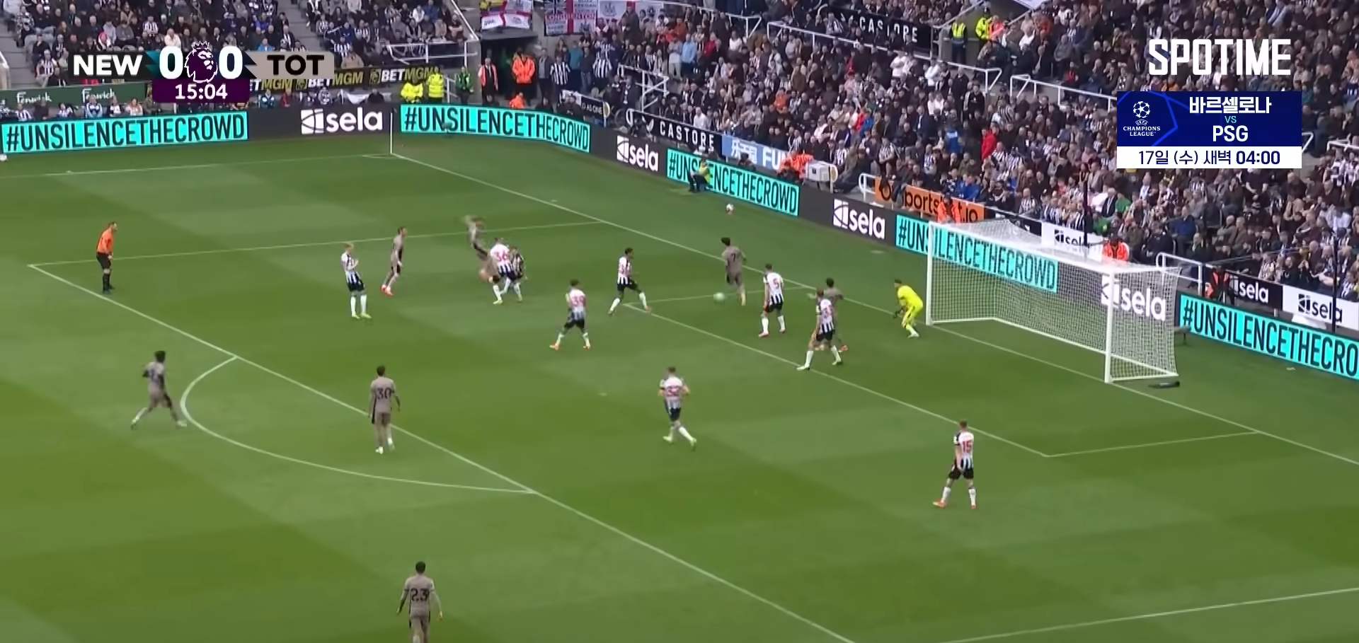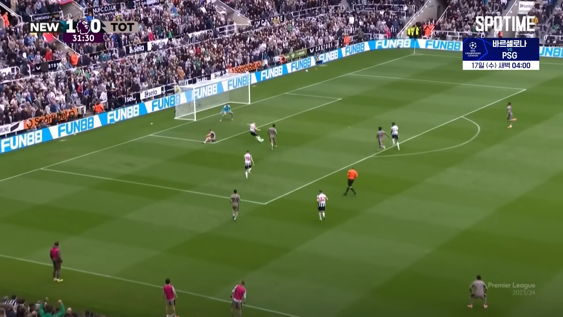 토트넘이 계속 공격을 하다 볼을 빼앗기며 앤서니 고든한테 볼이 연결되었고, 앤서니 고든이 수비수들 사이로 이사크에게 패스를