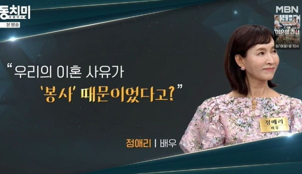 가장 큰 화두는 바로 '봉사'라는 키워드입니다. 정애리는 '속풀이쇼 동치미'에서 전남편이 자원봉사로 바쁜 나머지 서로 대화할 시간이 줄어들었다고 밝혔습니다. 이런 상황 속에서 신뢰가 무너지게 되었고 이는 결국 이 혼으로 이어졌다고 설명했습니다