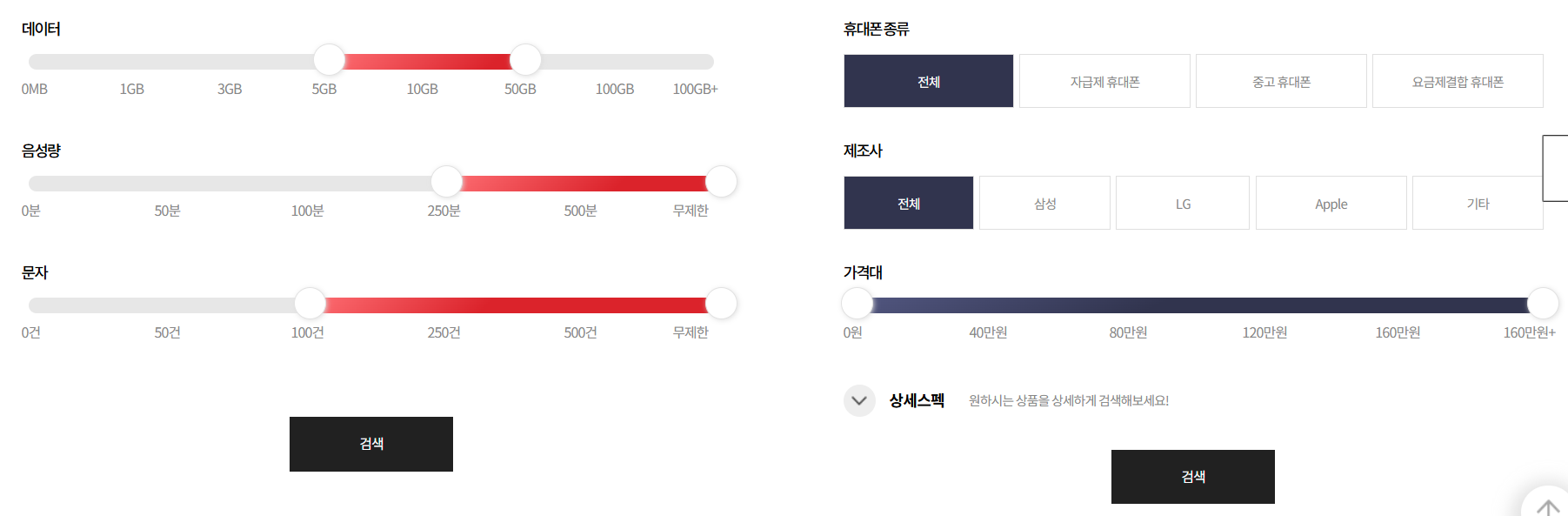 - 가격, 데이터량, 음성, 문자 기준으로 필터링 가능
