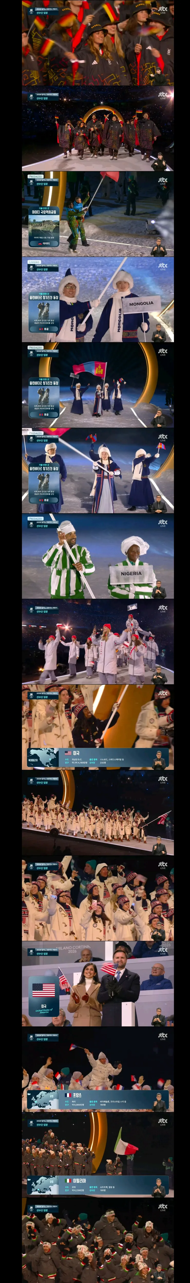 자랑스러운 대한민국 선수단은 이탈리아어 알파벳 순서에 따라 22번째로 입장합니다. 기수로는 피겨의 왕자 차준환과 스피드 스케이팅의 박지우 선수가 확정되어 태극기를 휘날릴 예정입니다.
