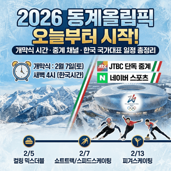 2026 밀라노 코르티나 동계올림픽의 서막을 알리는 개막식은 한국 시간으로 2월 7일 토요일 오전 4시에 시작됩니다. 이탈리아 현지와의 시차로 인해 새벽 시간대에 중계되지만, 주말의 시작인 만큼 많은 팬들이 실시간 감동을 함께할 것으로 예상됩니다.