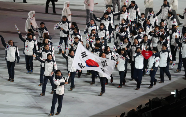 개막식에서 한국 선수단은91개국 참가국 중 73번째로 입장했습니다. 입장 순서는 중국어 표기 첫 글자 간체자 획수 기준으로 정해졌다고 합니다. 선수단 기수로는 쇼트트랙 선수인 곽윤기와 김아랑이 맡았습니다.