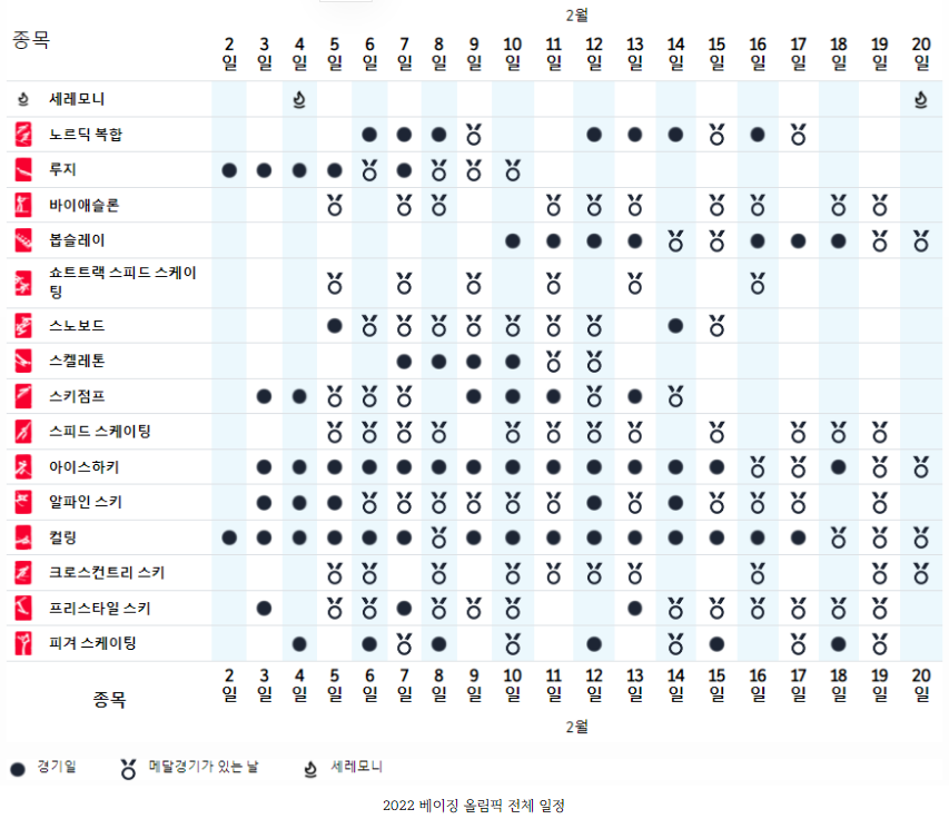 베이징 동계 올림픽 전체 경기 일정