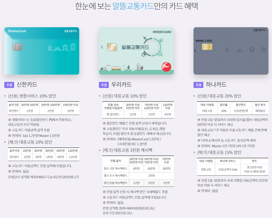 물론 이와 거의 유사한 또는 사용하기에 따라 더 많은 혜택을 주는 카드도 있습니다 - 국민 나라사랑 카드. 하지만 여러 복잡한 실적조건 없이 간단하게 할인 받기에는 알뜰교통카드를 추천 드립니다.